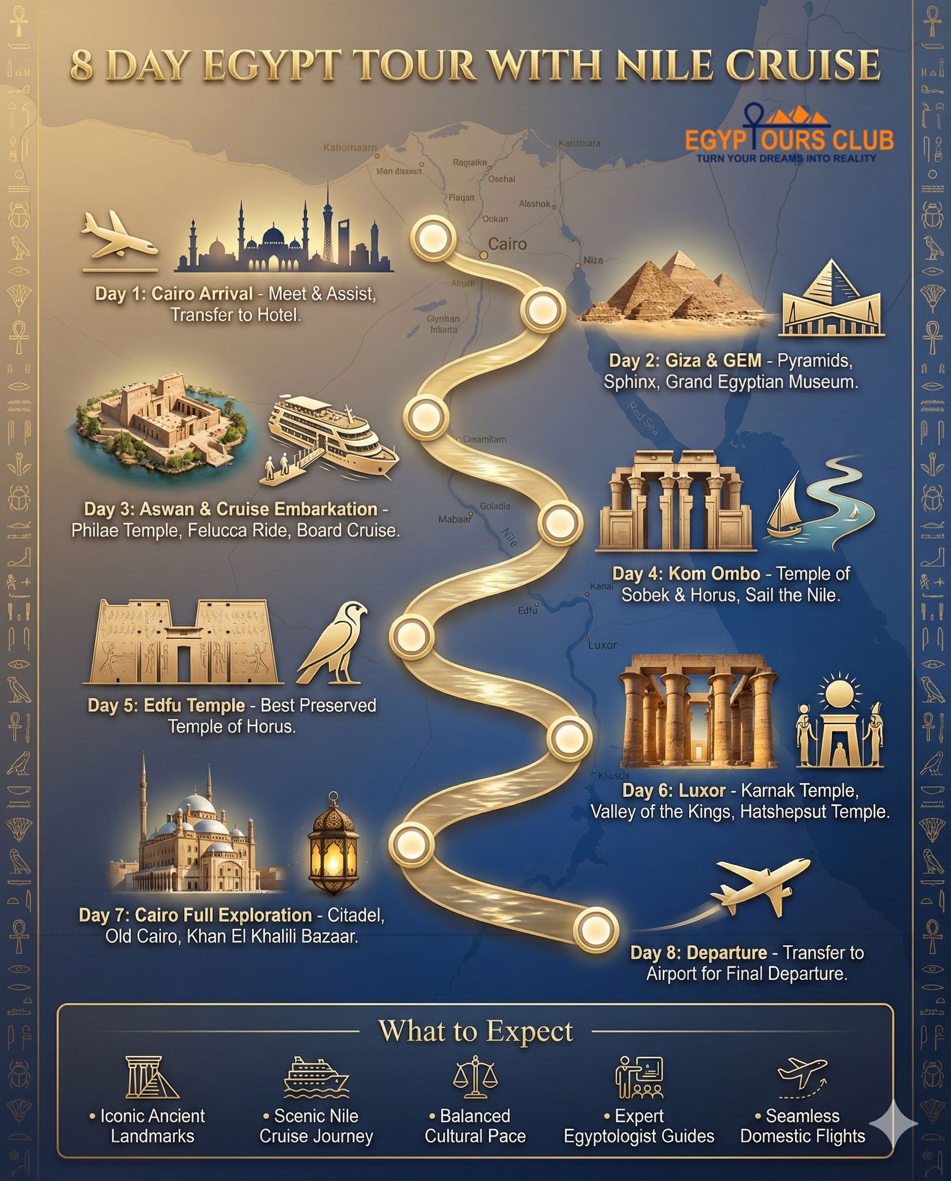 - This itinerary delivers a complete Egypt experience across land and river: