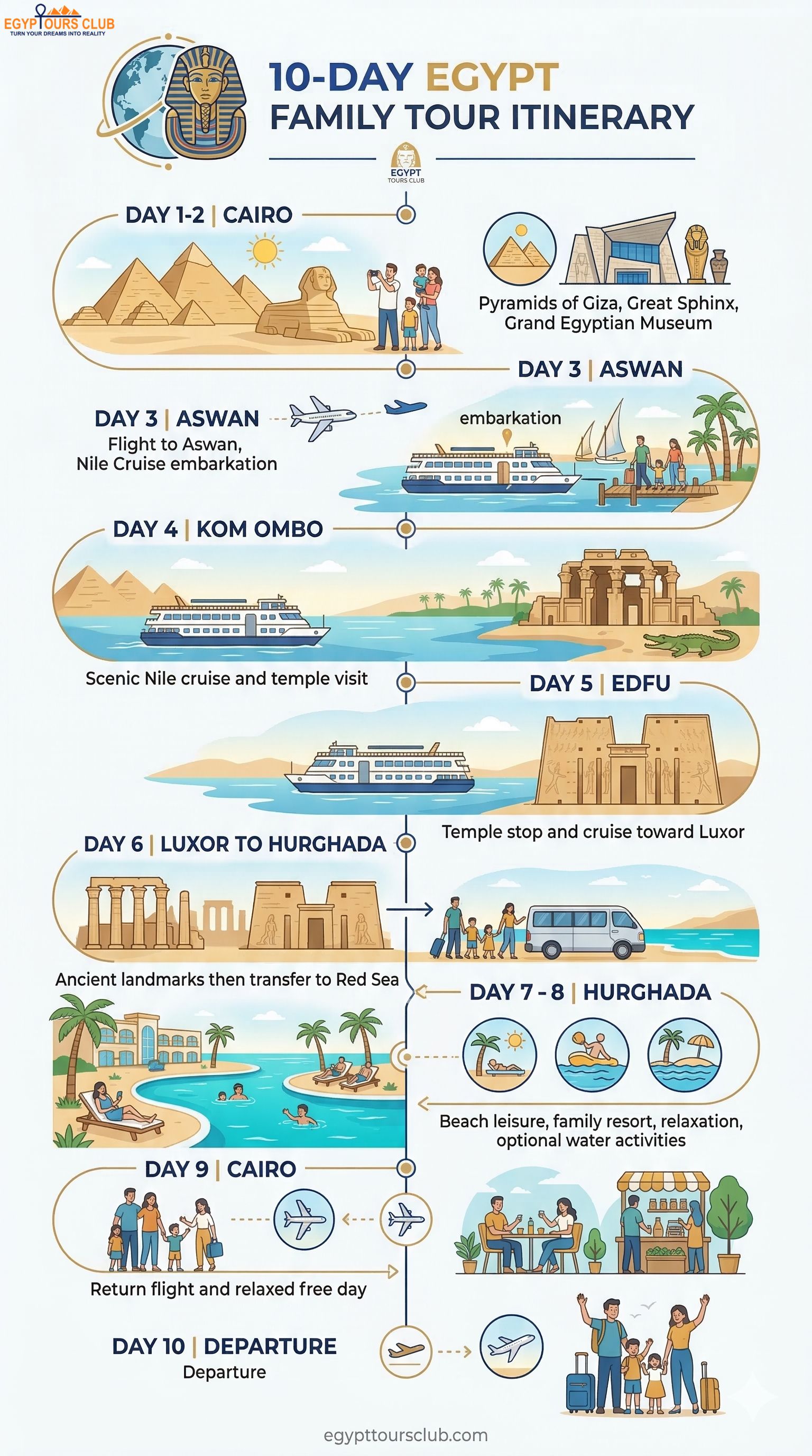 The Egypt family tour package 10 days is one of the most complete and well-balanced travel experiences for families looking to explore Egypt without stress or rushed schedules. This carefully designed 10 day Egypt family itinerary combines the ancient wonders of Cairo, the unique experience of a Nile cruise in Egypt, the historical treasures of Luxor and Aswan, and the relaxing beaches of Hurghada on the Red Sea, creating a seamless journey that blends discovery, comfort, and leisure.