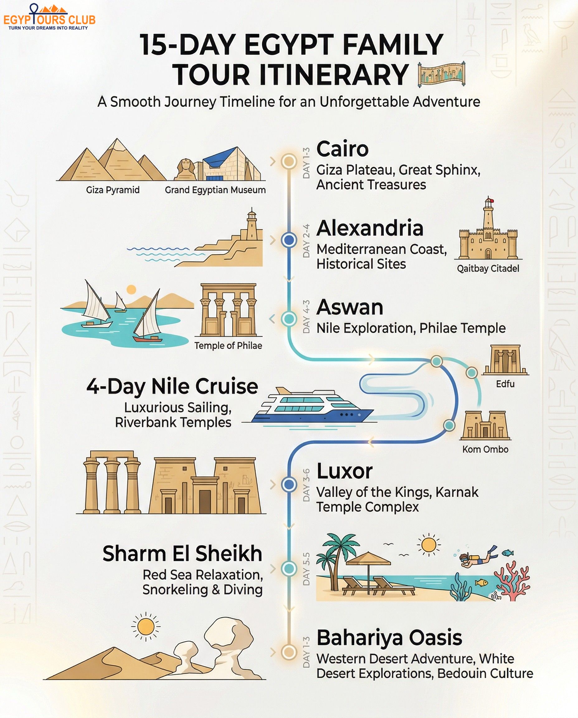 If you are searching for the most complete Egypt family tour package 15 days, this itinerary delivers an unmatched combination of history, relaxation, and adventure. From the Pyramids of Giza to a scenic Nile cruise, from the beaches of the Red Sea to the magical landscapes of the White Desert, this ultimate Egypt family tour 15 days is designed to provide a once-in-a-lifetime experience. As one of the most comprehensive Egypt family vacation packages, it offers everything families need in one seamless and unforgettable journey.