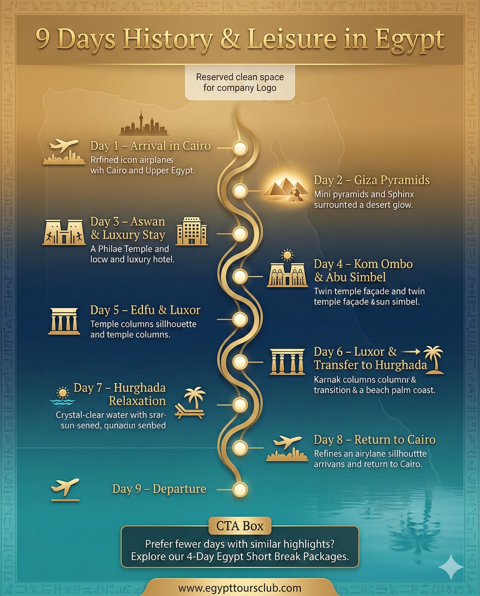 Este viaje de 9 días por Egipto combina historia emblemática con momentos inolvidables de descanso. Descubre las Pirámides de Guiza, la Esfinge, los templos de Luxor, el Valle de los Reyes y los impresionantes templos de Asuán. Finaliza con dos noches relajantes en Hurgada, logrando el equilibrio ideal entre exploración y relajación.