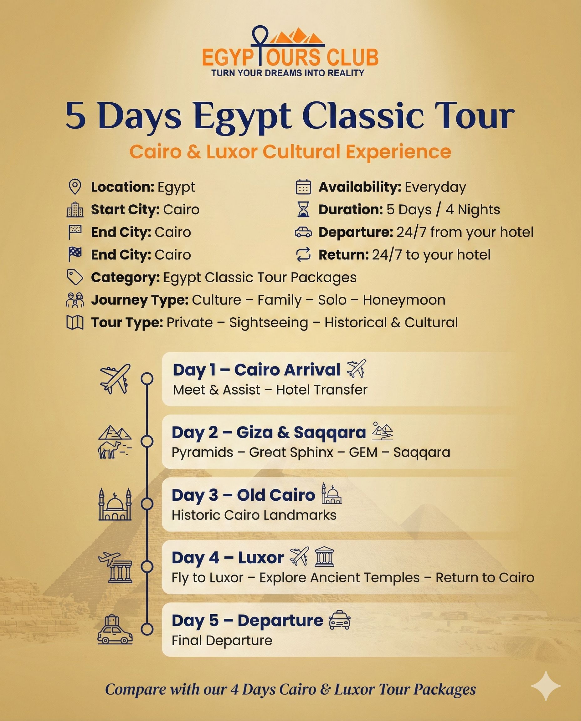 - Hora y lugar de regreso: 24/7 al aeropuerto de El Cairo